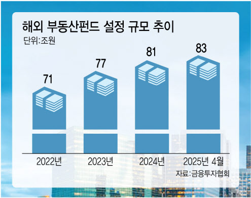 28일 금융투자협회에 따르면 해외부동산펀드 설정규모는 지난 4월 말 기준 83조원을 기록했다. 지난 2022년 71조원, 2023년 77조원, 작년 81조원으로 증가세가 다소 주춤하기는 해지긴 했지만 올 들어서도 설정 규모가 서서히 커지고 있는 것이다.