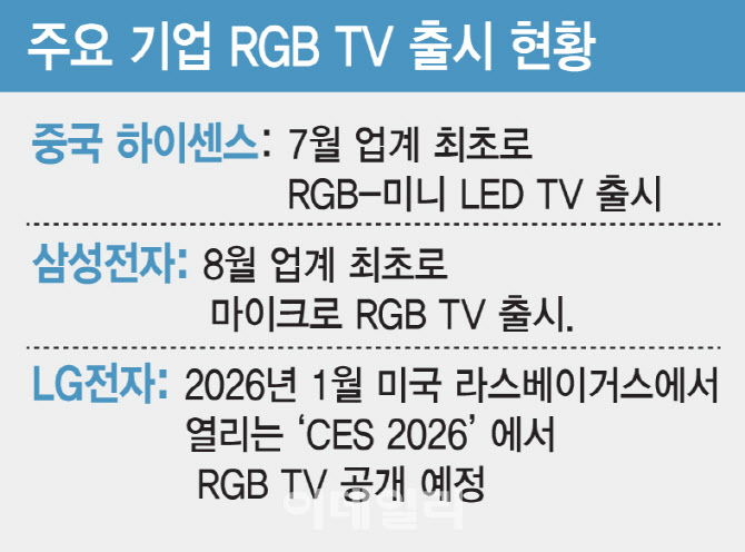 삼성전자와 LG전자는 OLED(유기발광다이오드) TV와 더불어 프리미엄 시장에서 수요를 다변화하기 위해 RGB TV에 뛰어들고 있다. 중저가형 제품으로 중국의 저가 공세에 대응하면서도, 프리미엄 전략을 유지하면서 수익성을 회복하겠다는 구상이다. 업계 관계자는 “국내 기업들은 여전히 OLED를 중심으로 중국과의 격차를 벌리고 있지만, 프리미엄 LCD TV 기술력을 높이고 고객 선택지를 넓힌다는 차원에서 RGB TV를 내놓고 있다”고 말했다.