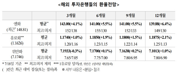 국제금융센터가 지난 21일 발표한 해외 IB들의 환율전망 평균치를 보면 12개월 후 달러·엔 전망치는 139.88엔으로 집계됐다. 지난 18일 기준 148.81엔보다 6% 낮은 수준이다.