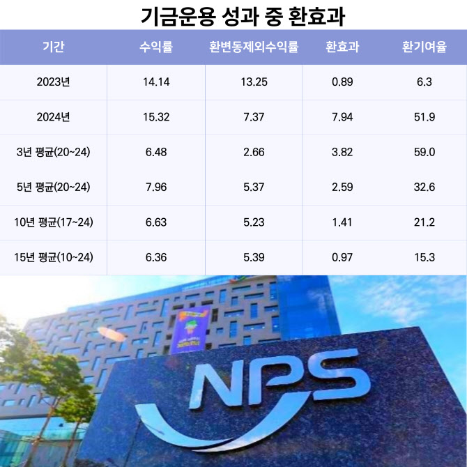 또한 국민연금은 수익률을 원화로 계산하는 만큼 달러 강세가 되면 해외 투자자산에서 환차익이 발생하는 구조다. 특히 ‘역대 최고치’였던 작년 기금운용 수익률 15.32%에서 원화환산 효과가 차지하는 비중이 절반 이상이었다.