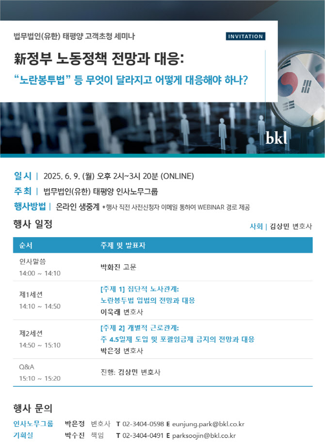 최근 태평양에 합류한 박화진 고문(전 고용노동부 차관)의 인사말로 시작되는 이번 웨비나의 첫 번째 세션은 태평양 이욱래(사법연수원 22기) 변호사가 ‘노란봉투법 입법의 전망과 대응’에 대해 발표할 예정이다. 두 번째 세션에서는 태평양 박은정(39기) 변호사가 ‘주 4.5일제 도입 및 포괄임금제 금지의 전망과 대응’을 주제로 발표한다.
