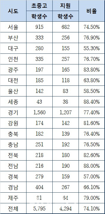반면 대구(55.3%)·경북(57%)·울산(58.5%)·대전(63.8%)·경남(66.1%) 등 5개 지역은 무상급식 실시율이 평균에 미치지 못했다.