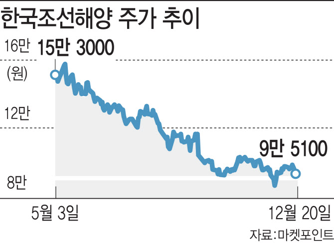 지난 5월과 견주면 주가는 하락세는 더욱 가파르다. 한국조선해양(009540)은 5월 16만500원을 기록하기도 했지만 현재 9만원대로 내려왔다. 대우조선해양(042660)은 5월 4만300원까지 올랐지만 7개월이 지난 현재 주가는 반토막 수준이다. 현대미포조선(010620) 역시 5월 9만4100원을 기록했지만 24.9% 하락한 상황이다.