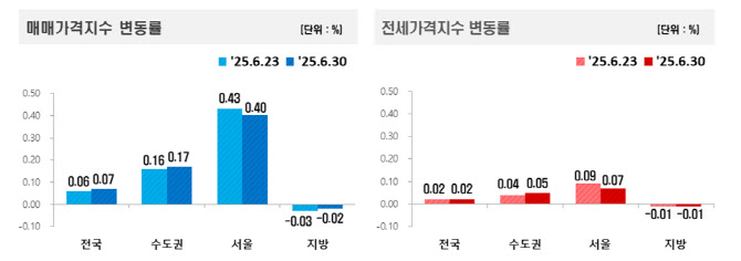 한편 전국 주간 아파트 전세 가격은 0.02% 올라 가격 상승세가 전주와 같았다. 서울은 0.07% 올라 전주(0.09%) 대비 상승폭이 둔화했다. 서울 25개 자치구의 아파트 전세 가격 상승률이 전반적으로 둔화했다. 가장 많이 오른 곳은 강동구로 0.32% 상승, 전주(0.36%) 대비 상승폭이 줄었다.