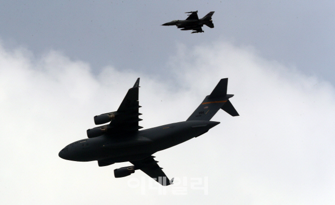 [이데일리 김태형 기자] 한국전쟁 정전협정 체결 65주년인 27일, 전쟁 당시 북한 지역에서 전사 또는 실종된 미군 유해를 싣고 북한 원산 갈마비행장을 출발한 미군 수송기가 오산 미 공군기지에 도착하고 있다. 사진공동취재단