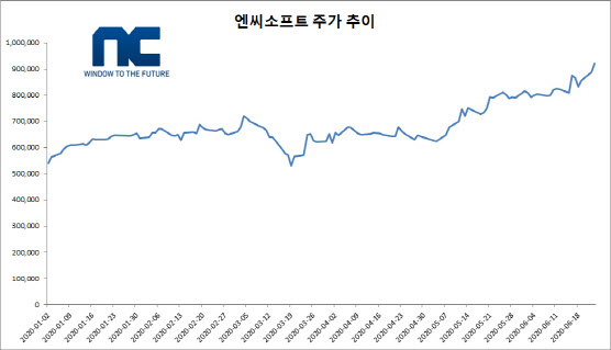 엔씨소프트는 코로나19가 팬데믹으로 번진 3월 19일 종가 53만원을 저점으로 23일 92만원까지 오르며 석 달여간 상승률은 73.6%(39만원)에 달했다. 이는 같은 기간 코스피지수 상승률 46.2%(673.6)을 27.4%포인트 가량 웃도는 수준이다.