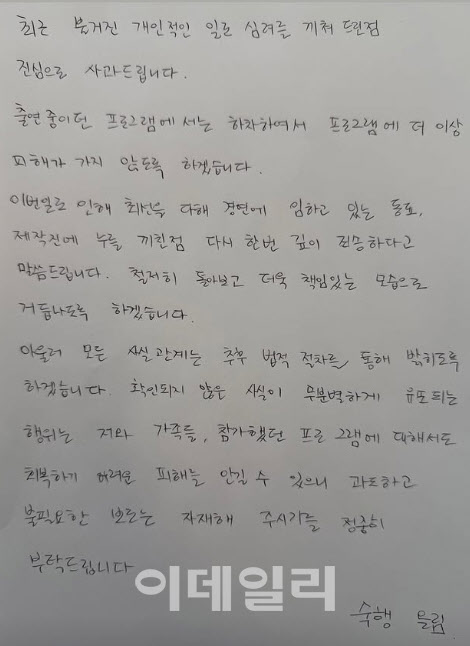이어 그는 “출연 중이던 프로그램에서 하차해 더이상 피해가 가지 않도록 하겠다”며 “이번 일로 인해 최선을 다해 경연에 임하고 있는 동료들과 제작진에게 누를 끼쳐 죄송하다”고 덧붙였다.