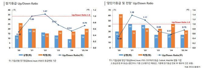 반면 방위산업과 전력기기, 조선, 해운, 바이오, 호텔, 화장품 등 업종에서는 우호적 업황과 경쟁력 기반 실적 개선으로 신용등급 상향이 이뤄졌다. 금융업권에서도 일부 보험사와 NPL업체, 캐피탈사 등이 자본적정성 개선 및 리스크 관리 강화로 신용도 상향을 기록했다.