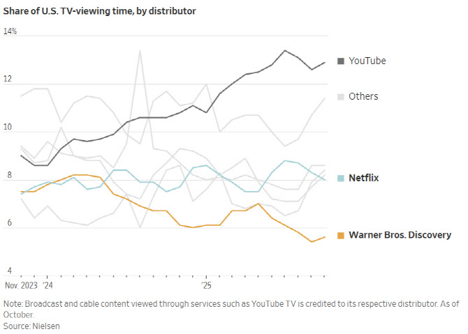 한때 방송과 케이블 TV에서 고객을 빼앗아온 넷플릭스가 이제는 유튜브에 시청 시간을 내주는 형국이다. 워너 인수로 콘텐츠 라이브러리를 대폭 확장하면서 시청자 체류 시간을 늘릴 수 있는 기반을 마련했다.