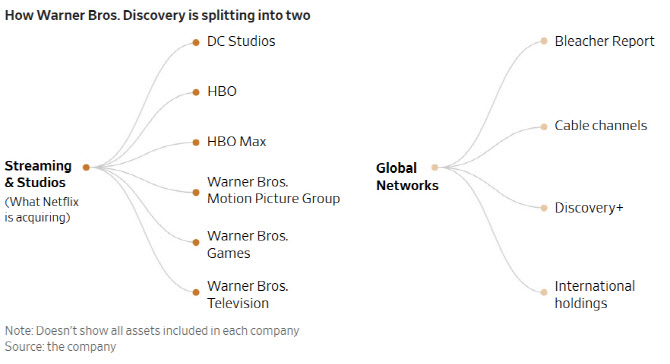 워너는 지난 6월 회사를 둘로 나누는 분할 계획을 발표한 바 있다. CNN과 HGTV 같은 케이블 네트워크는 한 회사로, TV·영화 스튜디오와 게임 사업, HBO 맥스는 다른 회사로 분리된다. 넷플릭스는 스튜디오와 HBO 자산을 인수하게 되며, 거래는 분할 완료 후 마무리될 예정이다.