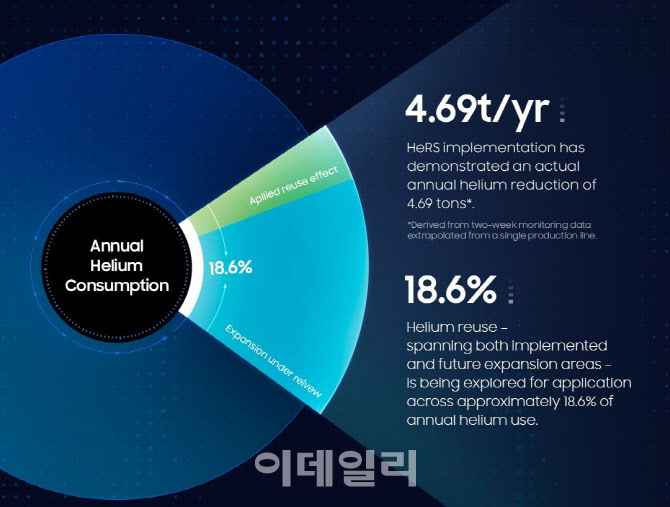 8일 업계에 따르면 삼성전자는 반도체 생산 공정에서 생성된 고순도 배기 헬륨을 회수, 정제해 다시 사용할 수 있도록 하는 헬륨 재사용 시스템(HeRS)을 업계 최초로 개발했다. 현재 반도체 화성공장 일부 라인에 시범 적용한 상태다. 앞으로 반도체 생산라인에 추가로 도입하며 헬륨 재사용 시스템을 확장할 예정이다.