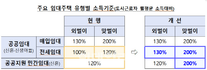 우선 공공지원 민간임대 신혼부부 특별공급 유형에 외벌이와 맞벌이 구분없이 소득 기준(전년도 도시근로자 월평균 소득대비)이 120%로 일괄적용됐지만, 앞으로는 맞벌이 소득 기준(200%)을 새롭게 도입한다. 이에따라 2024년 도시근로자 2인가구 기준 월평균 소득기준을 감안하면 지원대상이 월소득 389만 9312원에서 649만 8854원을 버는 가정으로 확대된다. 3인가구 기준으로는 월 863만 8378원 소득 가정에서 1439만 7298원 소득 가정도 특공 청약이 가능한 셈이다. 연봉으로 환산하면 부부합산 1억 7276만원에 이른다.