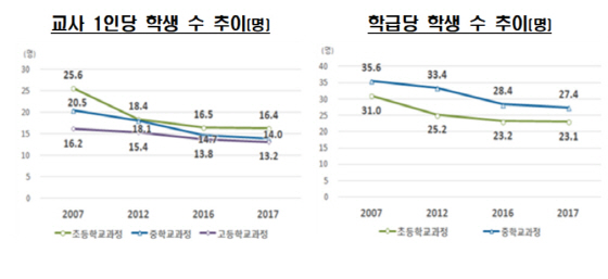 교육부와 한국교육개발원이 10일 공개한 ‘OECD 교육지표 2019’에 따르면 저출산 영향으로 학생 수가 줄면서 우리나라 교사 1인당·학급당 학생 수가 감소하고 있지만 여전히 경제협력개발기구(OECD) 평균을 웃도는 것으로 나타났다. 지난 2017년 국내 교사 1인당 학생 수는 △초등학교 16.4명 △중학교 14.0명 △고등학교 13.2명이었다. 모두 전년보다 소폭 감소했지만 초등학교·중학교는 OECD 평균인 15.2명과 13.3명을 웃돌았다, 다만 고등학교는 OECD 평균(13.4명)보다 적었다. 학급당 학생 수도 OECD 평균보다 많았다. 한국의 학급당 학생수는 △초등학교 23.1명 △중학교 27.4명으로 전년보다 줄었지만 OECD 평균인 21.2명, 22.9명 보다 많았다. 통계에서 교사는 휴직자와 기간제 교사를 포함했다.
