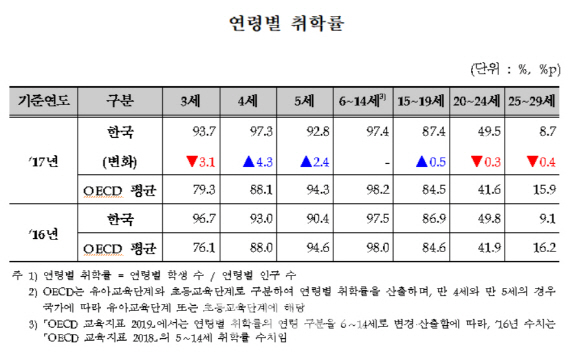 국내 만 3~4세의 취학률은 OECD 평균보다 크게 높았다. 2017년 기준 우리나라 만 5세 이하의 취학률은 △만 3세 93.7% △만 4세 97.3% △만 5세 92.8% 등으로 OECD 평균인 △만 3세 79.3% △만 4세 88.1% △만 5세 94.3% 등과 비교해 만 3~4세의 취학률이 훨씬 높았다. 2018년 기준 대학을 나온 국내 성인(25~64세) 비율은 49%로 OECD 평균(38.6%)보다 높았다. 특히 청년층(25~34세)은 69.6%로 OECD 국가 중 가장 높았으며 2008년 이후 OECD 국가 중 1위를 유지하고 있다.