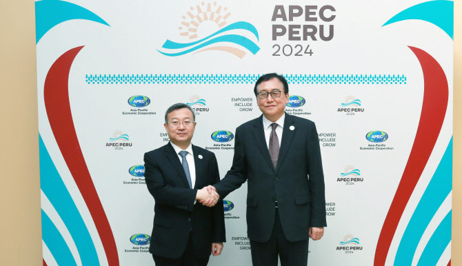 | | 정인교(오른쪽) 산업통상자원부 통상교섭본부장이 지난해 5월18일(현지시간) 페루 아레키파 컨벤션센터에서 열린 아시아태평양경제협력체(APEC) 통상각료회의를 계기로 만난 왕셔우원 중국 상무부 국제무역협상대표와 악수하고 있다. (사진=산업부) |
