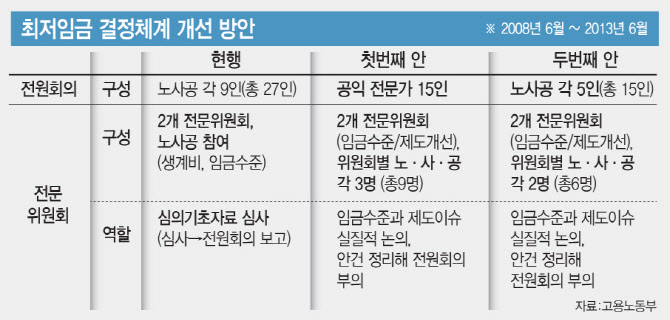‘공익위원 15인’ 안은 노사 없이 전문가가 최저임금을 결정하게 하자는 취지다. 연구회는 “노사정이 추천하는 위원으로 3배수의 풀을 구성하고 이들 가운데 노사정 논의를 통해 최종 15인을 선정하는 방법”이라며 “이렇게 구성된 최저임금위원회가 최저임금 수준, 구분적용 여부 등을 심의하고 관련 안건을 최종 결정한다”고 설명했다. 노사공 5명씩 15명으로 구성하는 안은 최저임금 논의 효율성과 책임성을 고려해 지금보다 인원 수를 줄여야 한다는 공감대가 작용한 제언이다.