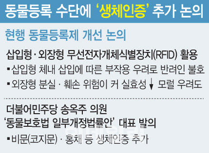 또 다른 손보사 관계자는 “생체정보가 반려동물 등록에 활용한다면 미등록 개체에 무선전자개체식별장치를 부착하는 도덕적 해이(모럴해저드)를 방지할 수 있다. 보험사에 등록 개체에 대해 보험료를 할인하는 이유이기도 하다”며 “다만 비문 인증 장비와 관련 시스템 개발 등 비용이 들어 동물병원과 반려인이 실제 활용할 수 있는 정책적인 뒷받침이 필요하다”고 언급했다. 국회는 입법 의지를 드러냈다. 송옥주 의원실 관계자는 “내장형에 거부감을 느끼는 반려 가구를 위해 생체인식 기술을 활용한 동물등록 방식을 적극적으로 검토할 필요가 있다”며 “실효성을 높여 국민이 신뢰할 수 있는 동물등록 환경을 조성하겠다”고 말했다.