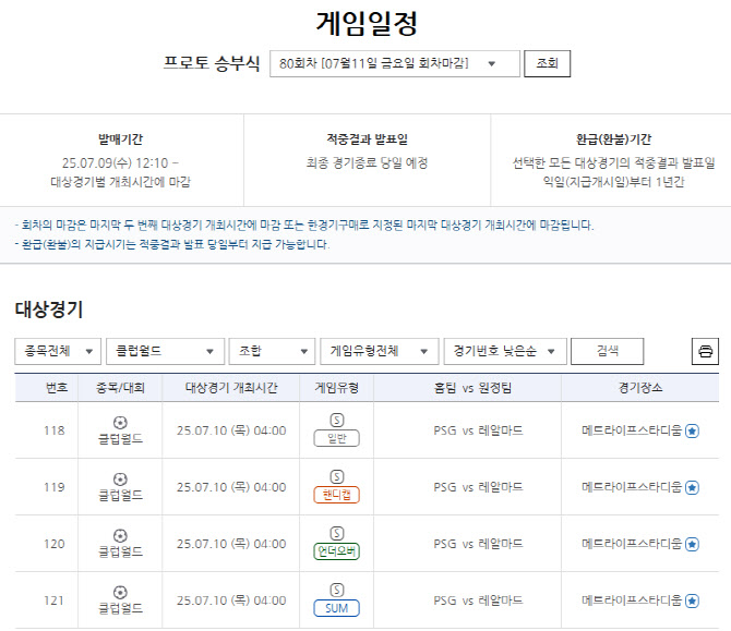 한편, 2025 FIFA 클럽월드컵 4강 PSG(홈)-레알 마드리드(원정)경기를 대상으로 하는 프로토 승부식 80회차의 자세한 경기 분석 내용 등은 공식 온라인 발매사이트 베트맨 내 토토가이드 페이지에서 확인할 수 있다.