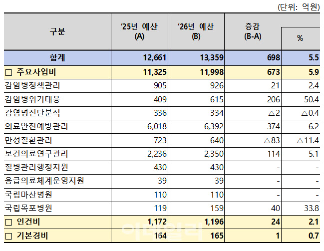 질병청은 2일 2026년도 질병관리청 예산이 1조 3359억 원으로 국회에서 의결됐다고 3일 밝혔다. 정부안 대비 0.3%(47억원) 증가했으며 2025년 예산(1조 2661억 원) 대비 5.5%(698억 원) 늘었다.