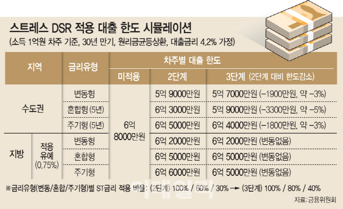 실제 시뮬레이션 결과에 따르면 연봉 1억원의 차주가 수도권에서 변동금리(4.2%) 주담대를 30년 만기로 신청하면 2단계에서는 약 5억 9360만원의 대출을 받을 수 있지만 3단계가 적용 시 한도가 5억 7431만원으로 줄어든다. 혼합형(5년 고정)이나 주기형(5년 주기 조정) 대출도 각각 약 2000만~3300만원까지 감소한다.