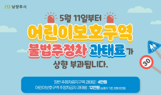 경기 남양주시는 어린이 교통안전 강화를 위해 지난해 11월 개정된 도로교통법 시행령이 오는 5월 11일 시행되는 것에 따라 어린이보호구역 내 주정차 위반 과태료를 최고 13만 원까지 상향한다고 27일 밝혔다.