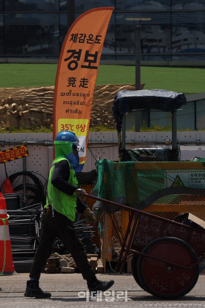 [이데일리 이영훈 기자] 서울 기온이 37.1도까지 오르면서 근대적인 기상관측을 시작한 이래 7월 상순 기온으로 역대 최고치를 기록한 8일 서울 한 공사현장에서 관계자가 일을 하고 있다.