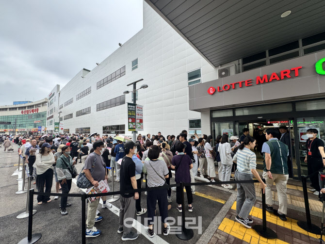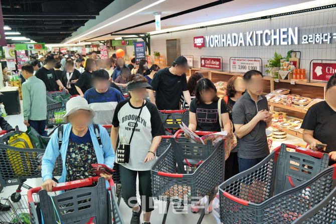| | 개장 첫날을 맞아 몰린 사람들이 계산대 앞에서 줄지어 늘어선 모습 (사진=롯데마트) |