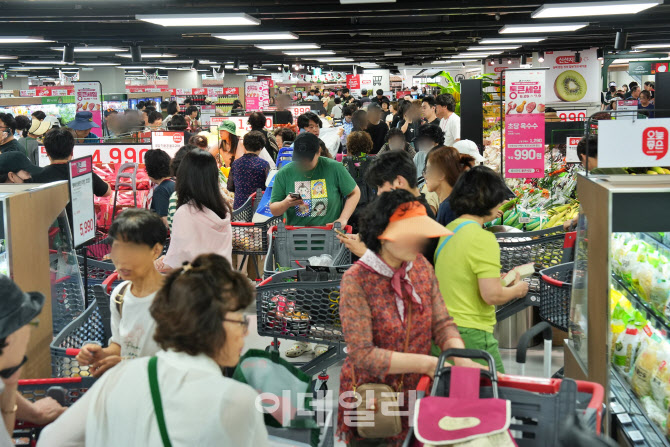 26일 오전 찾은 경기도 구리시 인창동의 롯데마트 그랑그로서리 구리점. 개점 첫날 매장 앞은 개장 전부터 인파로 북적였다. 대기줄은 주차장을 넘어 인근 아파트 단지 방향까지 이어졌다. 줄을 선 시민들은 전단지를 보며 행사 정보를 주고받는 데 여념이 없다. 오전 9시부터 50분을 기다려 입장했다는 박인화(39·주부) 씨는 “반값 수박, 백숙용 토종닭, 소불고기를 ‘득템’했다”며 “이젠 타 지역에서 장볼 필요가 없어 좋다”고 했다. 그의 장바구니엔 델리 도시락과 정육 상품 등이 가득 담겨 있었다.