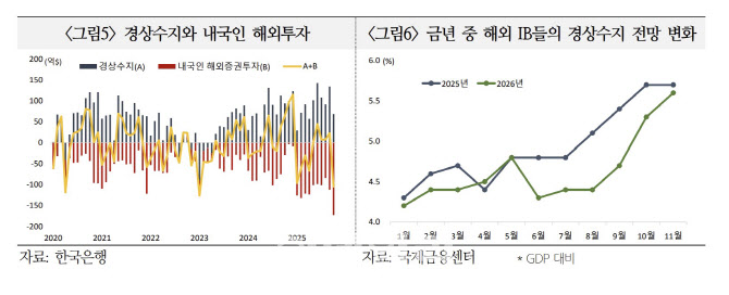 해외 IB들의 우리나라 국내총생산(GDP) 대비 경상수지 전망치 평균은 올해는 6월 말 4.8%에서 11월 말 5.7%로, 내년은 4.3%에서 5.6%로 상향 조정됐다. 내년 성장률 전망치 평균이 2%인 점을 고려하면 경상수지 흑자 규모는 올해보다 클 것으로 예상되고 있는 것이다.