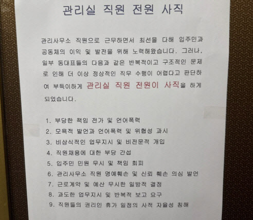 공지문에는 “관리사무소 직원으로 근무하면서 최선을 다해 입주민과 공동체의 이익 발전을 위해 노력해왔다”며 “그러나 일부 동대표들의 반복적이고 구조적인 문제로 인해 더는 정상적인 직무 수행이 어렵다고 판단해 관리실 직원 전원이 사직하게 됐다”는 내용이 적혀 있다.