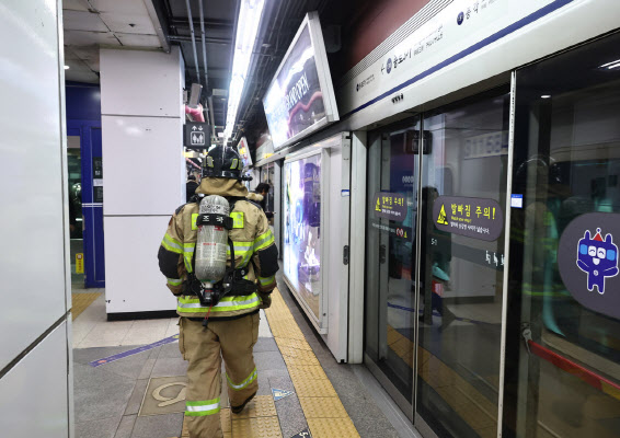 | | 23일 서울 지하철 1호선 종로3가역 상행선 열차의 차량 하부에서 연기가 발생해 승객들이 전원 하차, 대피했다. 사진은 이날 연기 발생 뒤 승강장 상황 살피는 소방대원 모습.(사진=연합뉴스) |