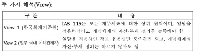 당시 일부 이해관계자들은 “일탈회계를 적용하면 개념체계의 자산·부채 정의를 따르지 않아도 된다”고 주장했으나, 한국회계기준원은 “일탈 규정 적용 시에도 개념체계를 준수해야 한다”는 입장을 견지해 왔다.