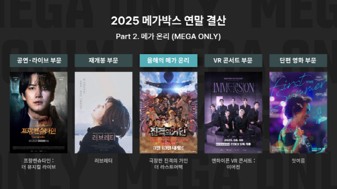 ‘메가 온리’ 재개봉 부문에서는 탄생 30주년을 맞이해 다시 관객과 만난 ‘러브레터’가 11만 명 이상을 동원, 총 7번의 재개봉 사례 중 최다 관객수를 기록했다. 공연·라이브 부문에선 극장 상영을 위해 13대의 멀티캠과 돌비 애트모스 사운드로 무장한 ‘프랑켄슈타인: 더 뮤지컬 라이브’가 9만 3000명의 관객수를 기록하며 역대 메가박스 뮤지컬 실황 작품 1위에 올랐다. 또한 2011년 당시 국내 와이드 개봉해 10만 명 이상을 동원한 ‘오페라의 유령: 25주년 특별공연’에 이어 역대 뮤지컬 실황 작품 2위에 올랐다.