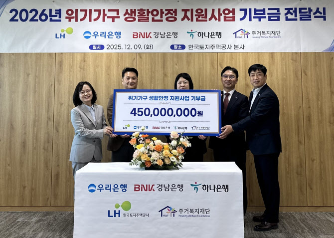 LH는 9일 진주 LH 본사에서 기부금 전달식을 열고 총 4억5000만원을 주거복지재단에 전달했다고 밝혔다. 기부금은 LH가 3억원, 우리·하나·경남은행이 1억5000만원(은행별 5000만원)을 각각 지원했다.