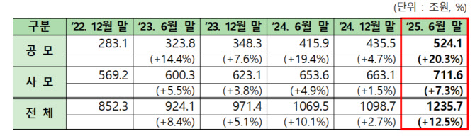 공모펀드의 순자산총액은 524조 1000억원으로 지난해 말 대비 20.3% 늘었다. ETF 제외 시 공모펀드 순자산총액은 지난달 말 기준 313조원이다. 사모펀드의 순자산은 711조 6000억 원으로 지난해 말보다 7.3% 늘어났다. 공모와 사모펀드별 비중은 각 42.4%와 57.6%로 집계됐다.