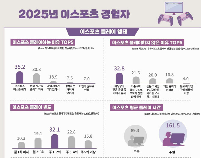 반면 최근 1년간 게임 플레이 경험이 없는 이용자 가운데서는 여성이 59.2%를 차지했다. 이들은 게임 플레이에 대한 진입 장벽으로 △채팅창의 잦은 욕설 등 비매너 유저(32.8%) △기존 유저 중심 구조로 인한 초보자 진입 장벽(21.6%) △고사양 PC·모바일 기기 요구(20%) △복잡한 게임 규칙(16.8%) 등을 꼽았다.