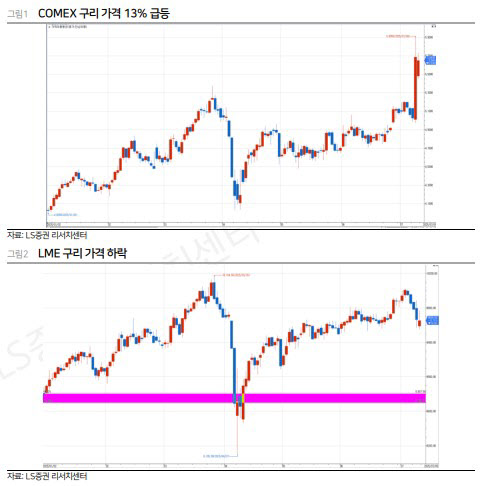 실제 시장에서는 미국의 선제 수입에 따른 가격 왜곡 현상이 나타나고 있다. 트럼프 대통령의 구리 관세 발표 이후 COMEX 구리 선물 가격은 13.1% 급등한 반면 런던금속거래소(LME) 가격은 1.2% 하락했다. 미국의 선제 수입으로 국제 수요가 줄어들면서 LME 재고가 감소한 영향으로 해석된다.