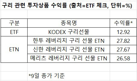 특히 구리 선물 가격을 2배로 추종하는 레버리지 ETN 수익률이 높게 나타났다. ‘한투 레버리지 구리 선물 ETN’(27.82%), ‘신한 레버리지 구리 선물 ETN’(27.67%), ‘메리츠 레버리지 구리 선물 ETN’(26.58%) 등이 전부 두 자릿수 수익률을 보였다.