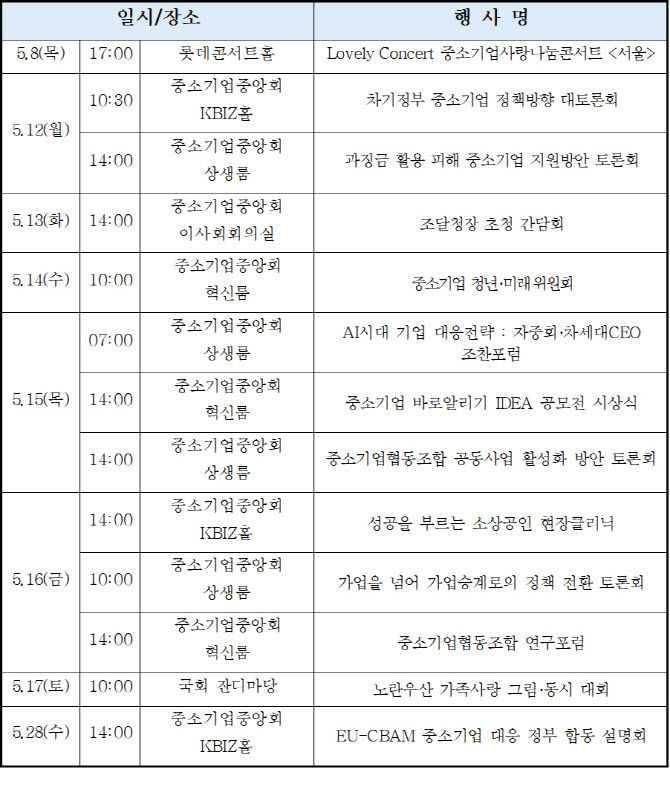 8일 문화경영 확산과 문화 소외계층 지원을 위한 ‘Lovely Concert 중소기업사랑나눔콘서트’를 시작으로 12일에는 ‘차기정부 중소기업 정책방향 대토론회’가 서울 여의도 중소기업중앙회에서 열린다.