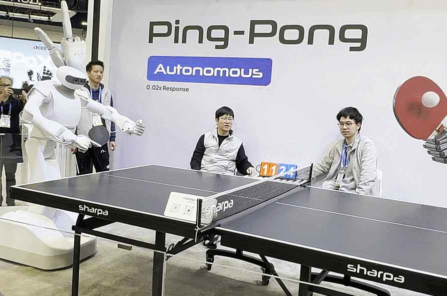 중국 샤르파는 고성능 이동형 양팔로봇 ‘노스’를 전시했다. 샤르파 노스는 22개의 자유도(DoF)를 갖춘 로봇손을 통해 카메라를 집어 사진을 찍거나, 탁구채를 쥐고 탁구를 하고 종이접기를 하는 등 섬세한 작업이 가능한 것이 특징이다. 샤르파는 노스가 실제 사람과 탁구 경기를 하는 모습을 시연했다. 시각 정보를 인식하고 행동하는 시각·언어·행동(VLA) 모델 기반으로, 0.02초 반응속도를 갖췄다. 실제로 탁구 경기를 할 때 사람에게 뒤지지 않고 매서운 스매싱도 빠르게 받아냈다. 이날 경기가 진행되던 와중 기록된 스코어는 12(노스)대 26(사람)이었다.