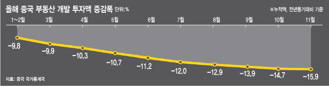 완커가 디폴트 상황에 몰린 건 그만큼 중국 부동산 시장의 침체가 심각한 수준에 직면했다는 의미다. 지표상으로 봐도 부진의 징후가 뚜렷하다. 이날 중국 국가통계국에 따르면 1~11월 부동산 개발 투자액은 지난해 같은 기간보다 15.9% 감소했다. 올해 누적 부동산 개발 투자액은 1~2월 지난해보다 9.8% 줄어든 후 꾸준히 감소폭을 키우고 있다.