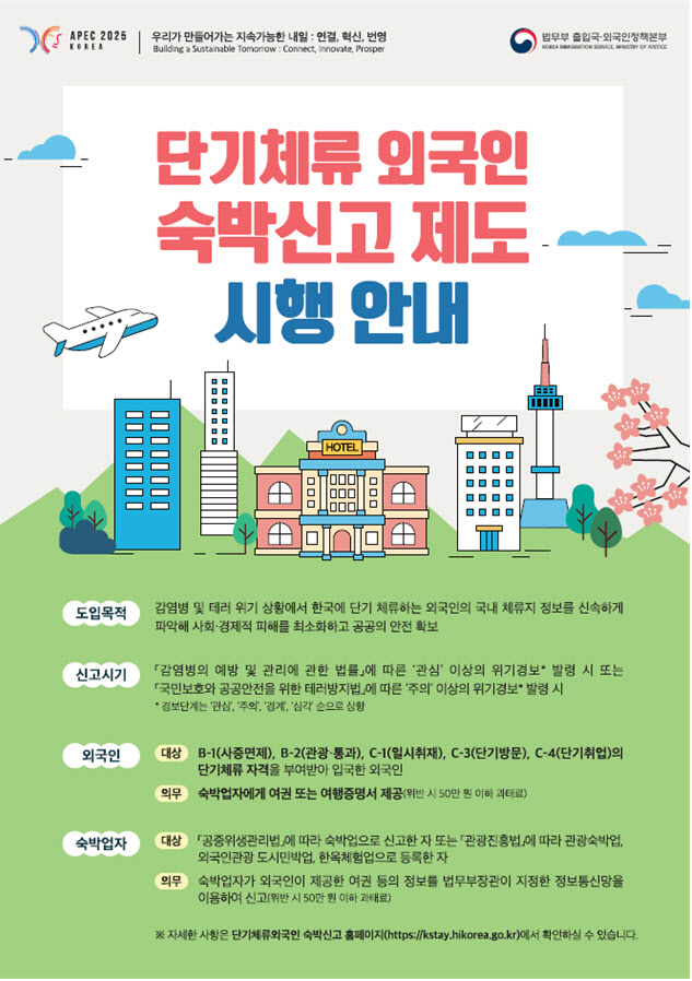정성호 법무부 장관은 “숙박신고제 시행으로 해당 기간 한국을 찾은 외국인과 관련 숙박업계가 불편을 겪게 될 것으로 예상한다”면서도 “APEC 행사 기간 동안 각국 정상을 포함한 외국인 방문객과 국민 모두의 안전을 위해 필요한 조치인 만큼 방문 외국인과 숙박업계의 적극적인 협조를 당부드린다”고 말했다.