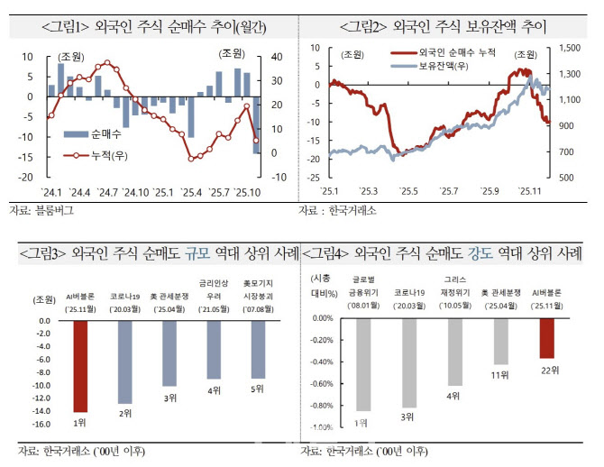 외국인의 국내 주식 매도세는 차익 실현 등 투자 포트폴리오 조정과 인공지능(AI) 버블에 대한 우려에 따른 것이라는 게 국금센터의 분석이다. 신술위 국금센터 책임연구원은 “외국인의 대규모 주식 매도는 한국 주식 펀더멘털에 대한 시각 악화보다는 주가 급등에 따른 포트폴리오 리밸런싱 압력과 AI 버블 경계감이 맞물리며 나타난 것”으로 평가했다.