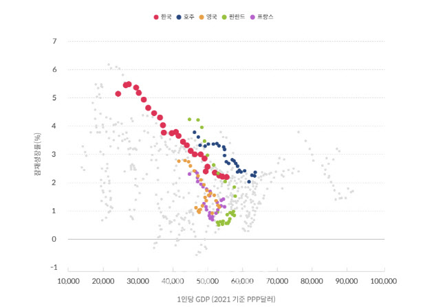 한 나라의 경제가 성숙해질수록 잠재성장률이 낮아지는 현상은 선진국과 신흥국을 불문하고 공통적으로 관찰된다. 실제로 OECD 국가들을 살펴보면, 우리나라를 비롯한 대다수 국가에서 1인당 국내총생산(GDP)가 증가할수록 잠재성장률이 하락하는 경향이 나타난다.