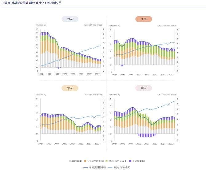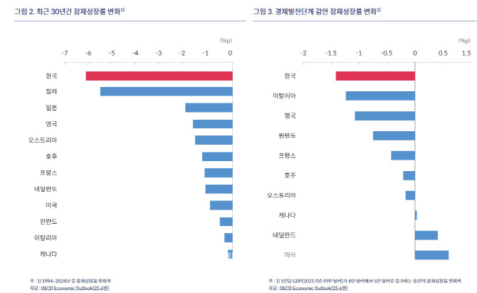한은에 따르면 2000년대 초반 5% 내외에 달했던 잠재성장률은 2010년대 들어 3% 초중반으로 하락한 데 이어 2016~2020년중 2% 중반으로 낮아진 이후 2024~2026년중에는 2% 수준으로 추정됐다. 지난 30년간 경제발전 단계가 나라마다 다르다는 점을 감안해 구매력(PPP) 기준 1인당 GDP가 4만 달러에서 5만 달러로 늘어나는 동안의 잠재성장률 변화폭을 비교해도, 동 기간 중 우리나라의 하락폭은 여타 주요국에 비해 상당히 크게 나타났다.