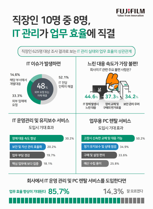 하토가이 준 한국후지필름BI 대표는 “이번 조사 결과는 많은 기업들이 IT 운영 부담을 줄이고 업무 생산성을 높일 수 있는 체계적이고 신속한 외부 솔루션을 기대하고 있다는 점을 보여준다”며 “한국후지필름BI는 IT 엑스퍼트 서비스를 통해 이러한 수요에 부응하고, 고객의 안정적 비즈니스 환경 구축에 기여해 나가겠다”고 말했다.