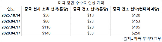 중국산 선박에 대한 항만 수수료는 2028년까지 시간이 흐를수록 단계적으로 높아지는 구조다. 중국 선사가 소유한 선박에는 오는 10월 14일까지 톤당 50달러, 내년 4월 17일까지 톤당 80달러, 2027년 4월 17일까지 톤당 110달러, 2028년 4월 17일까지 톤당 140달러의 수수료가 부과된다.
