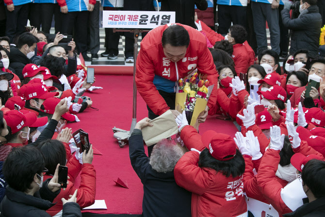 아울러 윤 후보는 지난해 4·7 재보궐선거로 부산시장에 당선된 박형준 시장을 언급하며 “부산 시민들이 작년 1월 1차로 민주당 정권을 심판해서 우리 박 시장을 압도적으로 당선시켜줬다”며 “이제 3월9일, 저와 우리 국민의힘을 믿고 압도적으로 지지해 정권교체를 해달라”고 했다.