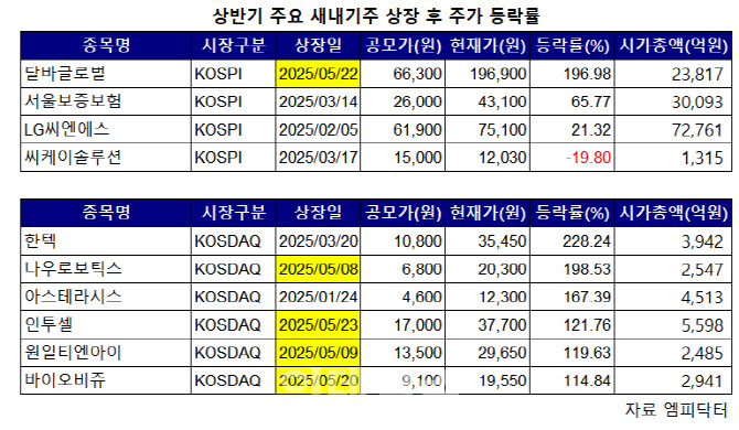 코스닥 시장에서도 상장 이후 현재까지 공모가 대비 100% 이상 오른 종목 6개사 가운데 4개사가 5월 새내기주들이다.