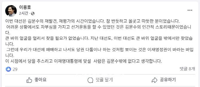 그는 이어 “이번 대선 과정은 김문수를 새롭게 바라보는 계기였다. 바르고 곧은 품성에 따뜻함까지 갖춘 인물”이라며 “힘든 여건 속에서도 당당하게 선거운동을 펼칠 수 있었던 것은 그분의 인간적인 서사 덕분”이라고 평가했다.